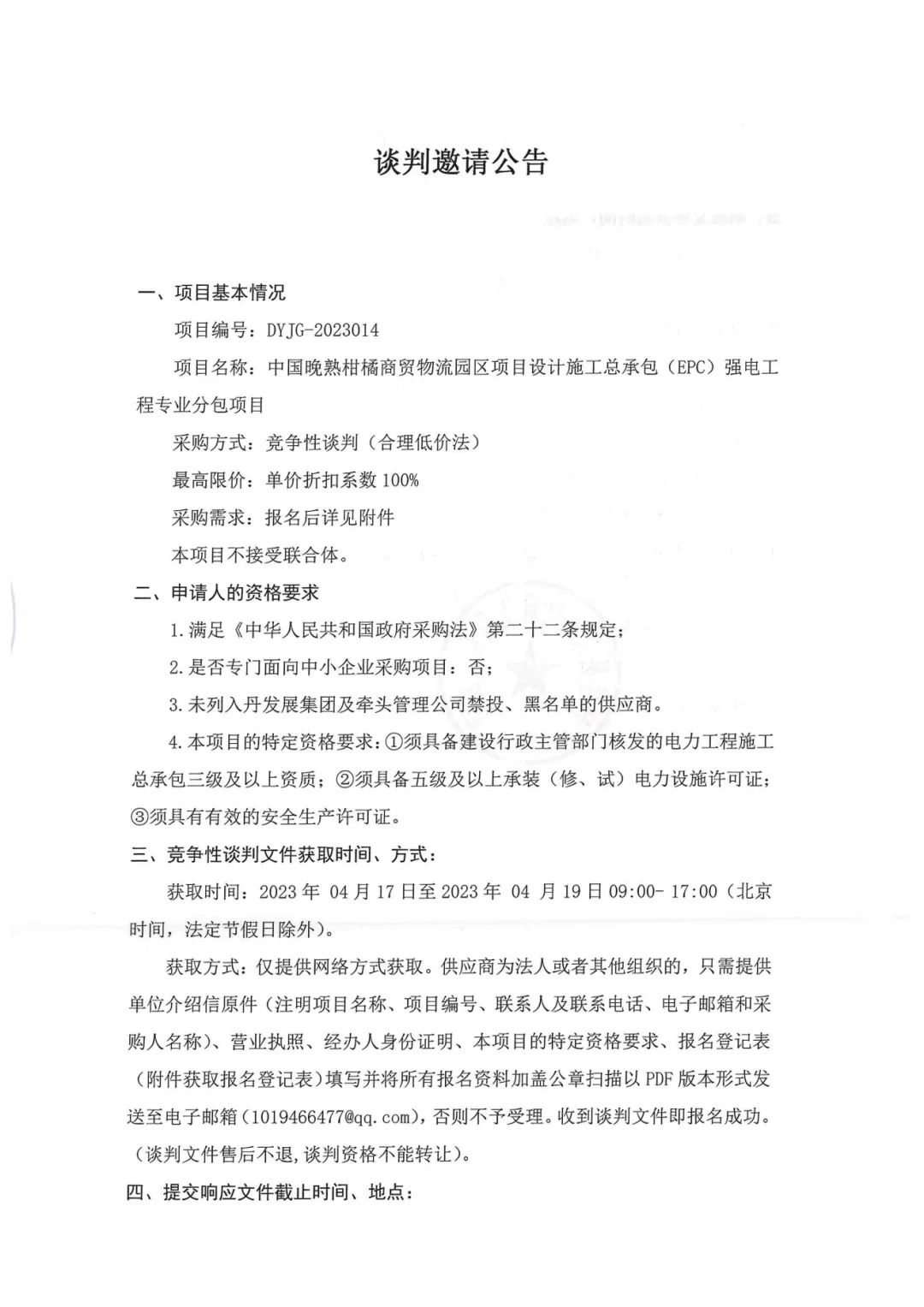 中國晚熟柑橘商貿(mào)物流園區(qū)項目設計施工總承包(EPC)強電工程專業(yè)分包項目談判邀請公告