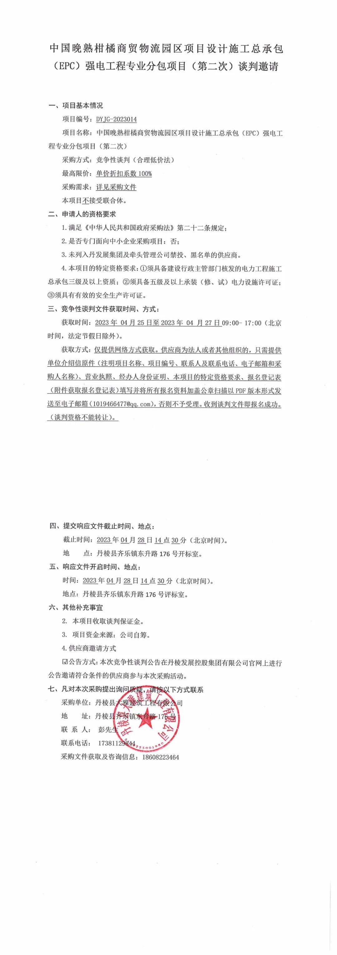 中國晚熟柑橘商貿(mào)物流園區(qū)項目設(shè)計施工總承包(EPC)強(qiáng)電工程專業(yè)分包項目(第二次)競爭性談判邀請