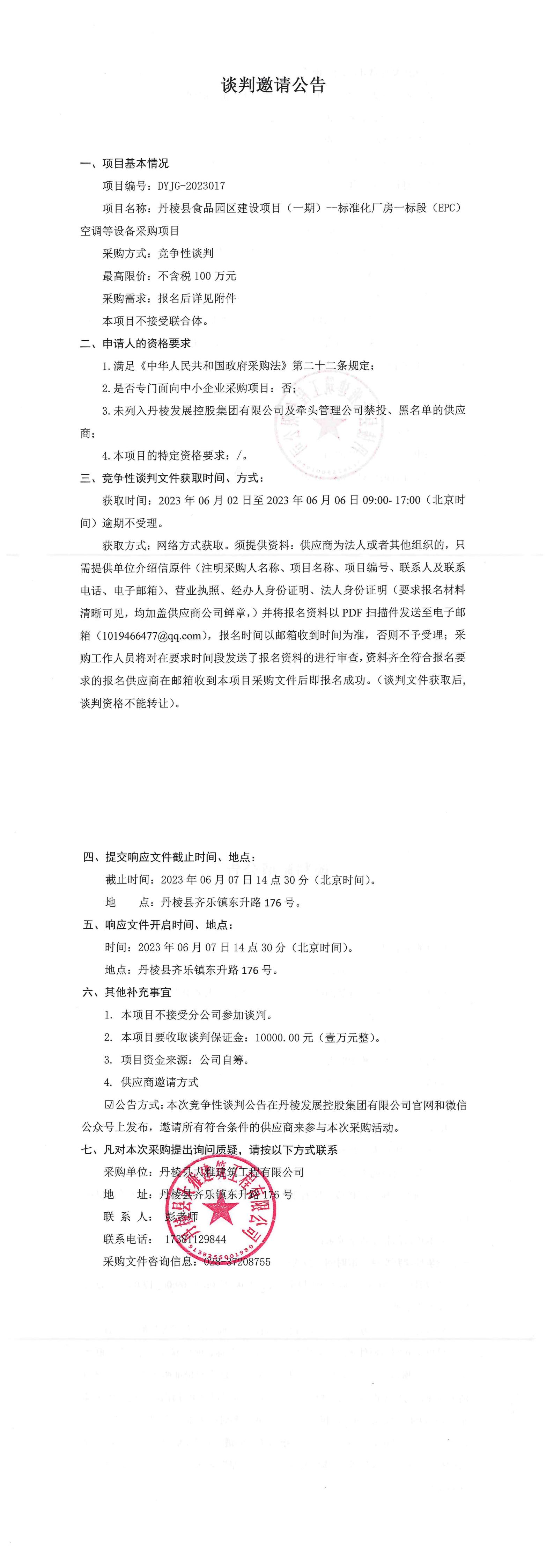 丹棱縣食品園區(qū)建設項目(一期)--標準化廠房一標段(EPC)空調等設備采購項目談判邀請公告