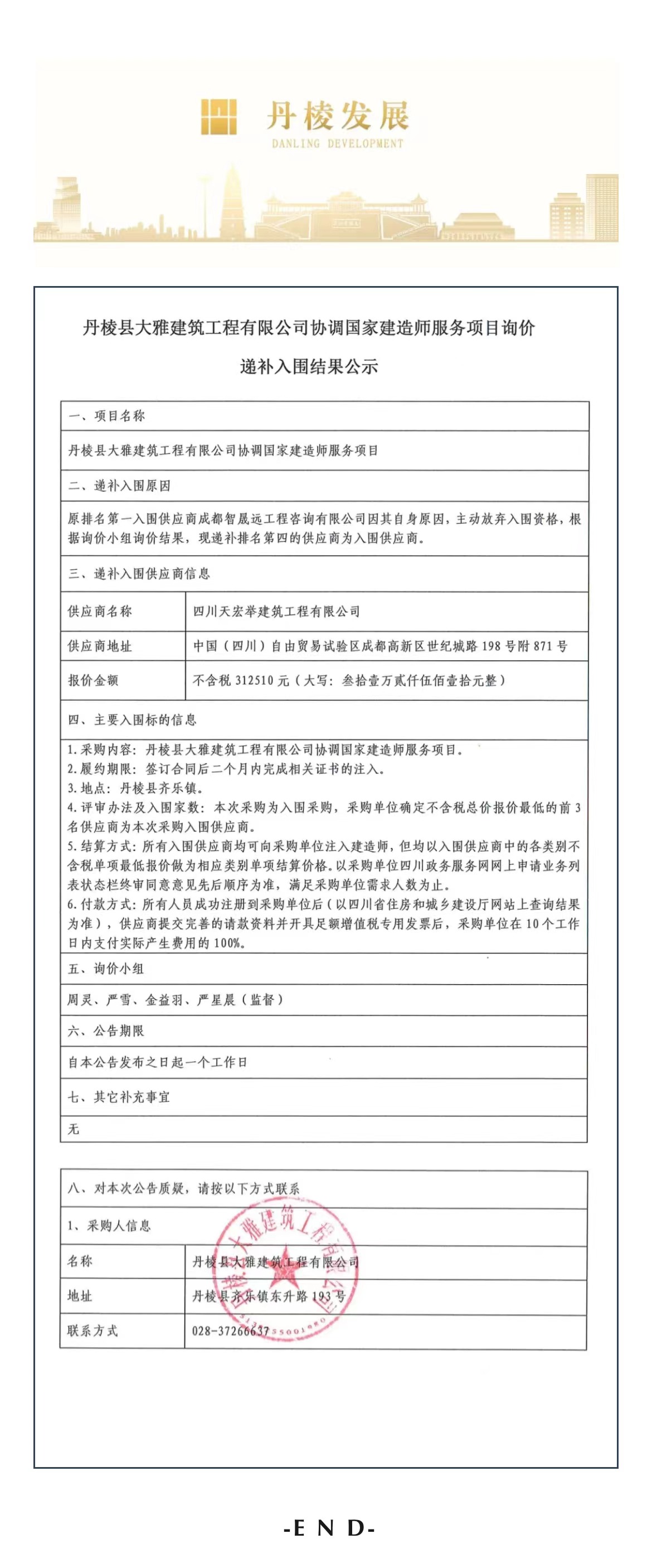 丹棱縣大雅建筑工程有限公司協(xié)調(diào)國(guó)家建造師服務(wù)項(xiàng)目詢價(jià)遞補(bǔ)入圍結(jié)果公示