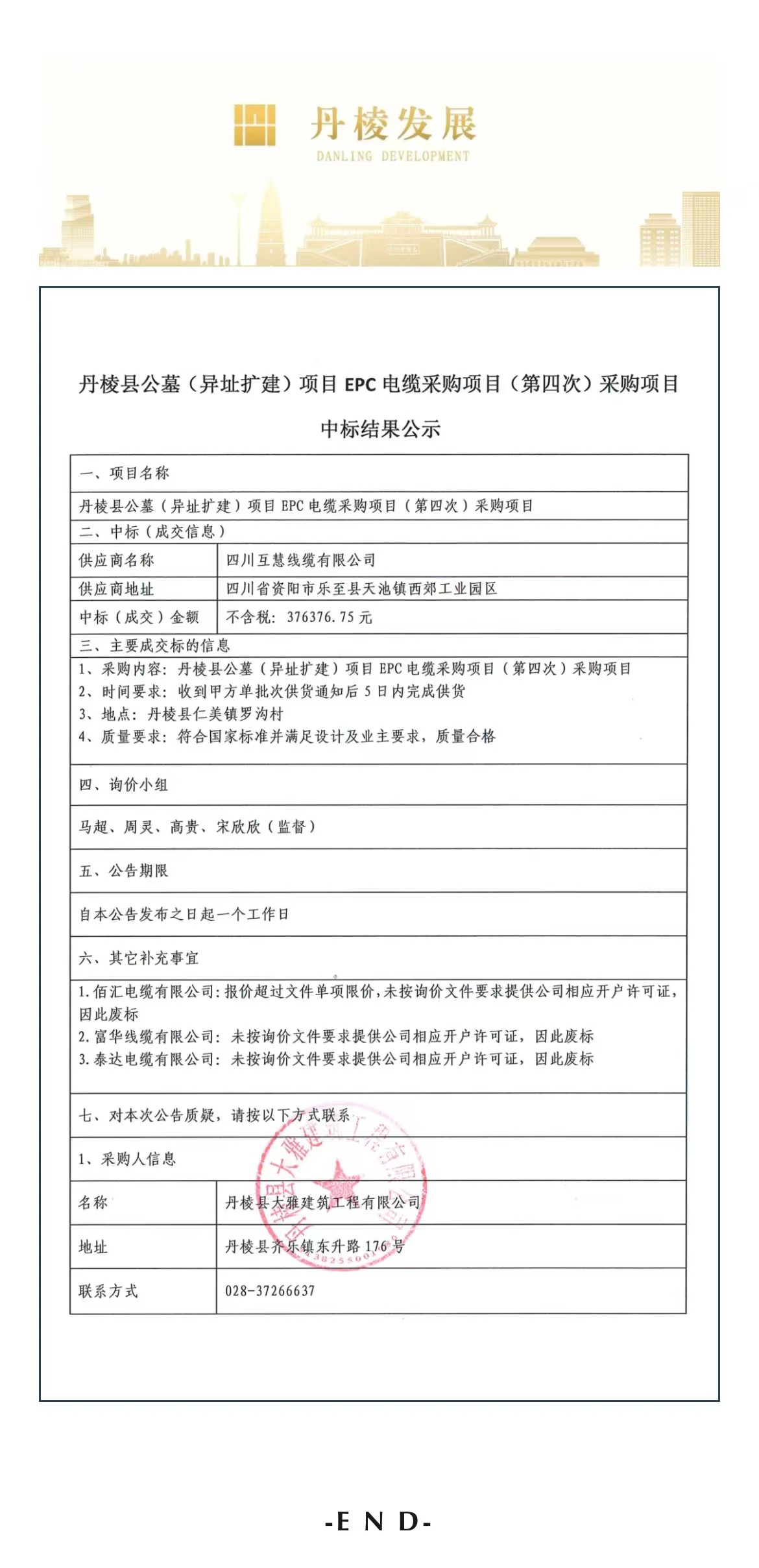 丹棱縣公墓(異址擴(kuò)建)項目EPC電纜采購項目(第四次)采購項目中標(biāo)結(jié)果公示