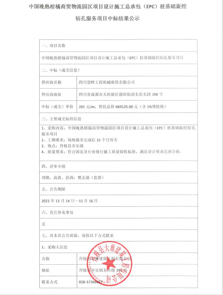 【大雅建筑公司】中國(guó)晚熟柑橘商貿(mào)物流園區(qū)項(xiàng)目設(shè)計(jì)施工總承包(EPC)樁基礎(chǔ)旋挖鉆孔服務(wù)項(xiàng)目中標(biāo)結(jié)果公示