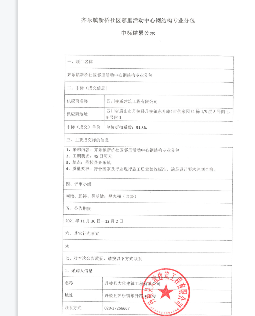 【大雅建筑公司】齊樂鎮(zhèn)新橋社區(qū)鄰里活動(dòng)中心鋼結(jié)構(gòu)專業(yè)分包中標(biāo)結(jié)果公示