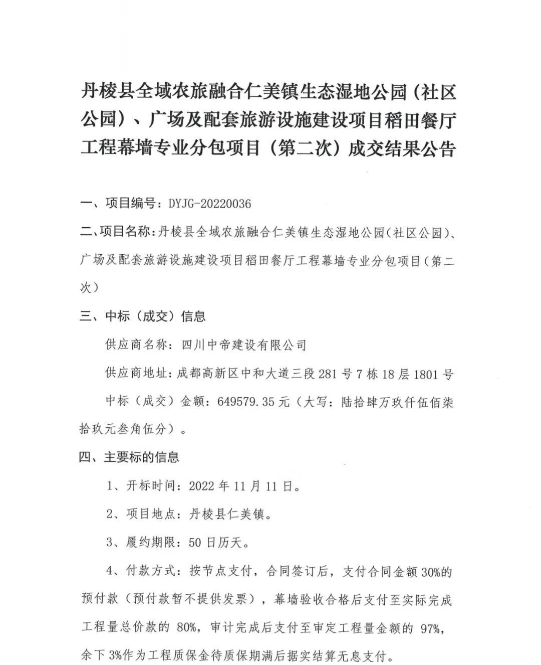 丹棱縣全域農(nóng)旅融合仁美鎮(zhèn)生態(tài)濕地公園(社區(qū)公園)、廣場(chǎng)及配套旅游設(shè)施建設(shè)項(xiàng)目稻田餐廳工程幕墻專業(yè)分包(第二次)成交結(jié)果公告