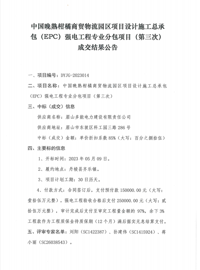 中國晚熟柑橘商貿(mào)物流園區(qū)項目設計施工總承包(EPC)強電工程專業(yè)分包項目(第三次)成交結果公告