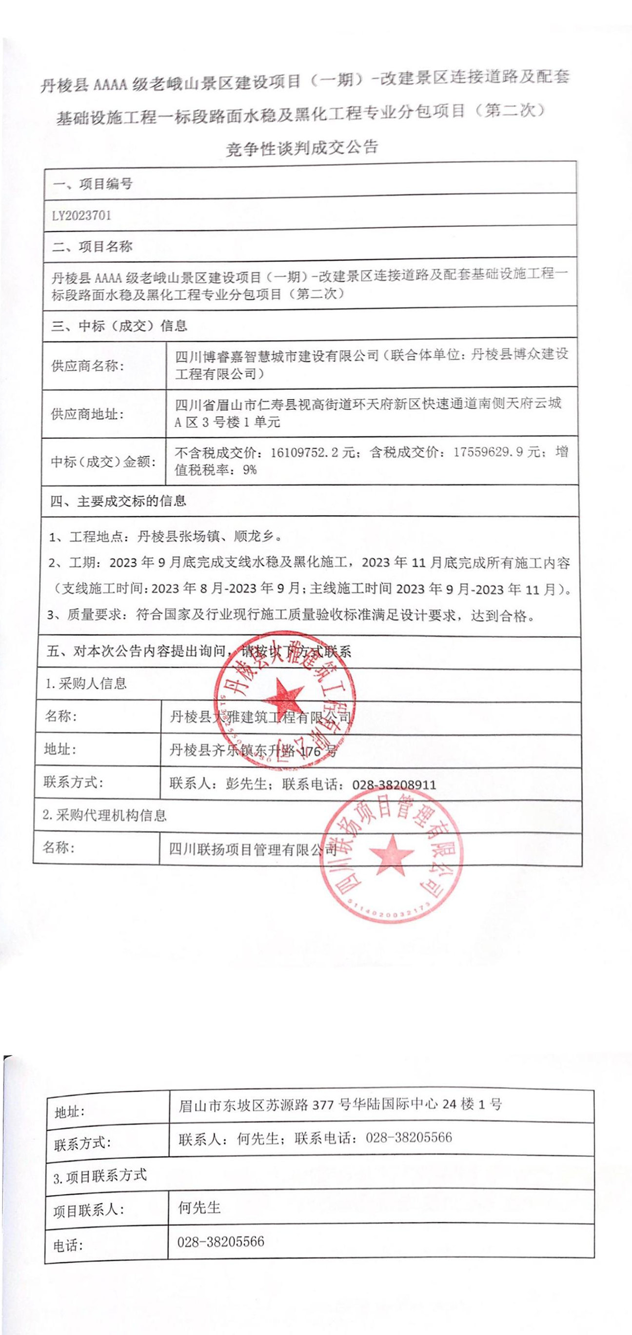 丹棱縣AAAA級(jí)老峨山景區(qū)建設(shè)項(xiàng)目(一期)—改建景區(qū)連接道路及配套基礎(chǔ)設(shè)施工程一標(biāo)段路面水穩(wěn)及黑化工程專(zhuān)業(yè)分包項(xiàng)目成交公告