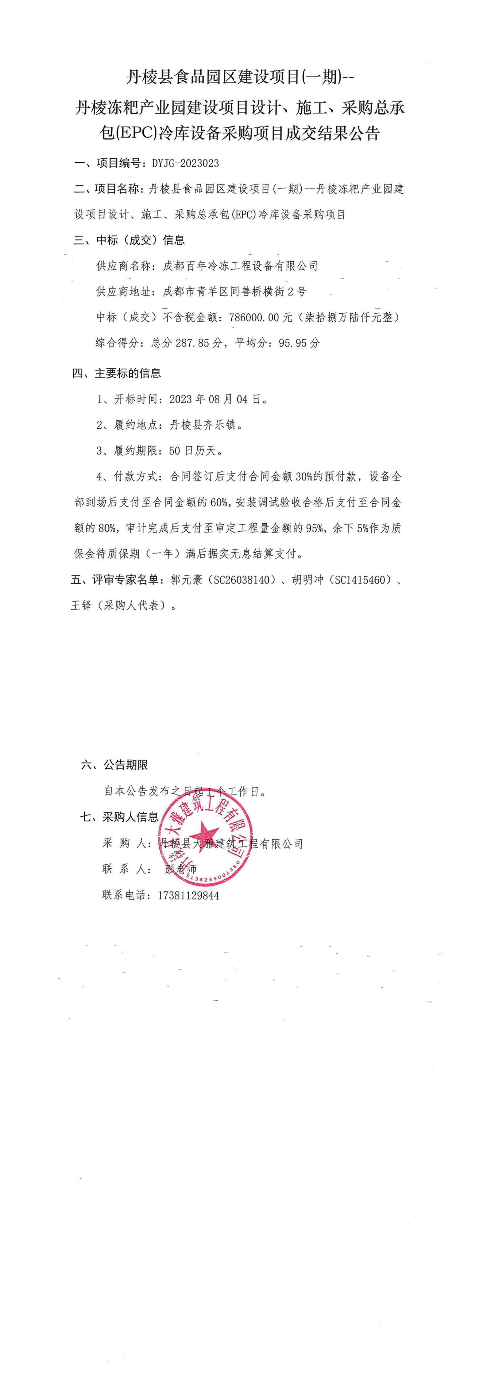 丹棱縣食品園區(qū)建設(shè)項目(一期)--丹棱凍粑產(chǎn)業(yè)園建設(shè)項目設(shè)計、施工、采購總承包(EPC)冷庫設(shè)備采購項目成交結(jié)果公告