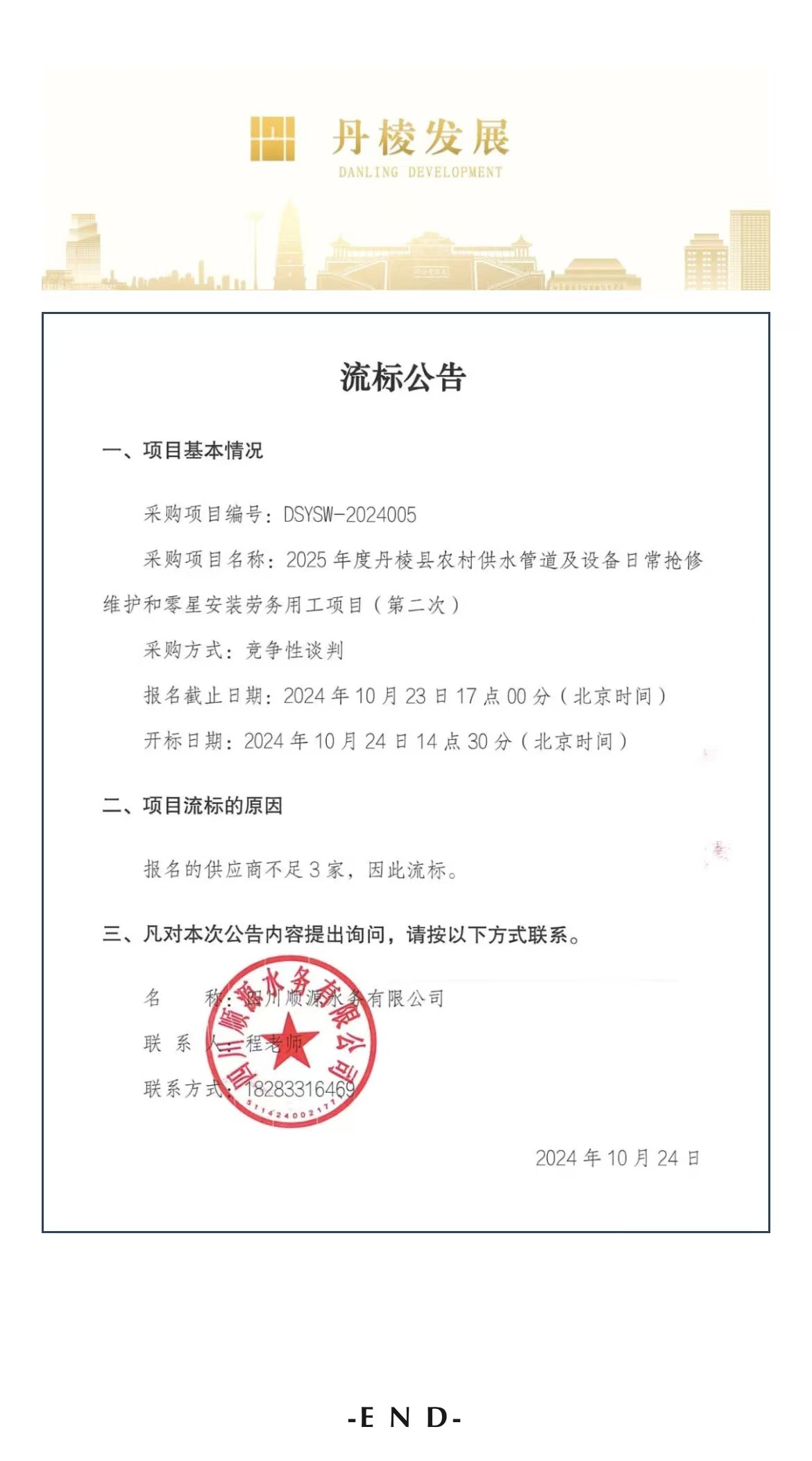2025年度丹棱縣農(nóng)村供水管道及設備日常搶修維護和零星安裝勞務用工項目(第二次)流標公告