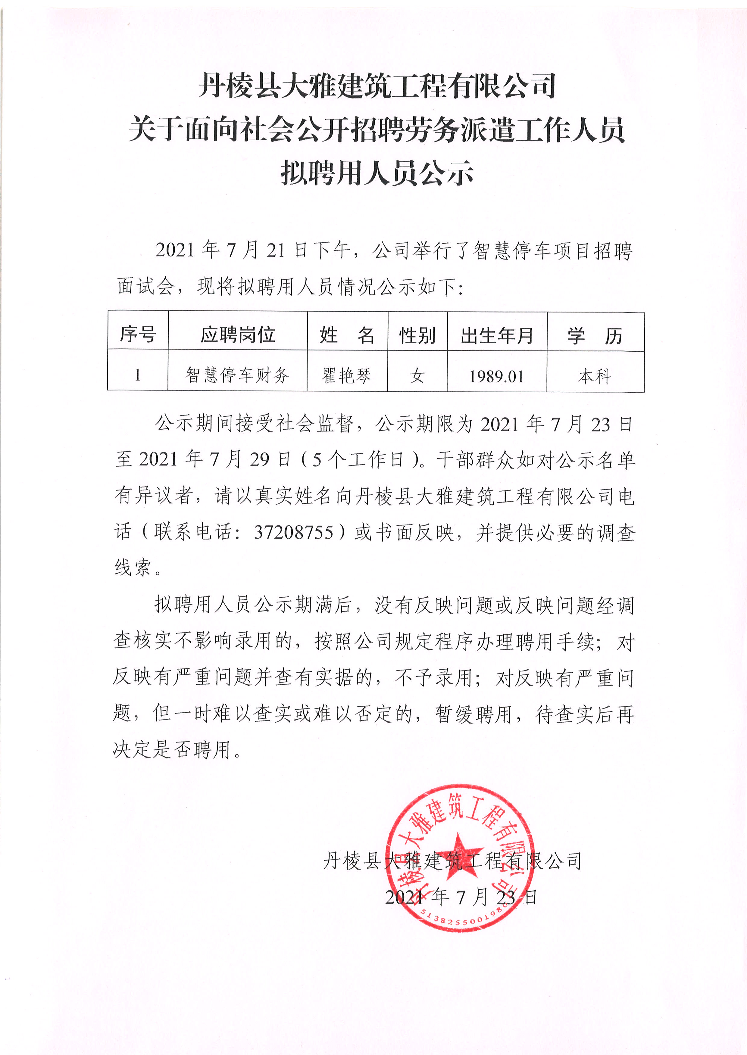 【大雅建筑公司】關(guān)于面向社會(huì)公開招聘勞務(wù)派遣工作人員擬聘用人員公示