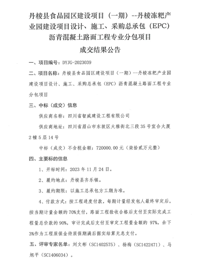 丹棱縣食品園區(qū)建設(shè)項目(一期)—丹棱凍粑產(chǎn)業(yè)園建設(shè)項目設(shè)計、施工、采購總承包(EPC)瀝青混凝土路面工程專業(yè)分包項目成交結(jié)果公告