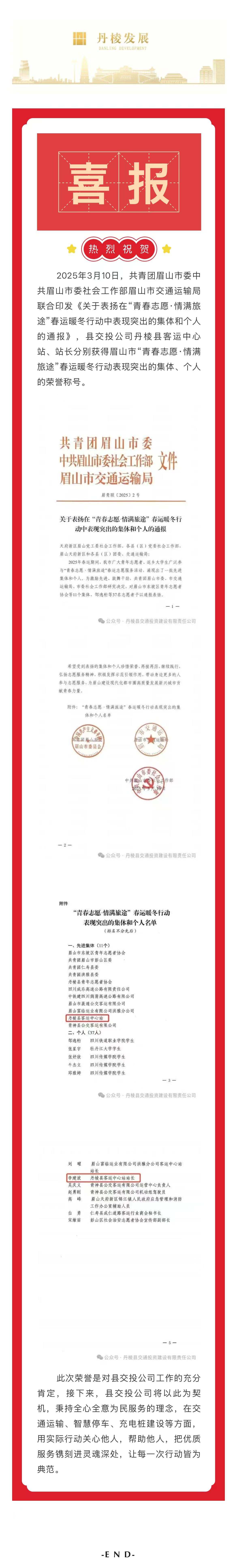 【縣交投公司】喜報(bào)!丹棱縣客運(yùn)中心站、站長分別獲得眉山市“青春志愿·情滿旅途”春運(yùn)暖冬行動(dòng)表現(xiàn)突出的集體、個(gè)人榮譽(yù)稱號(hào)